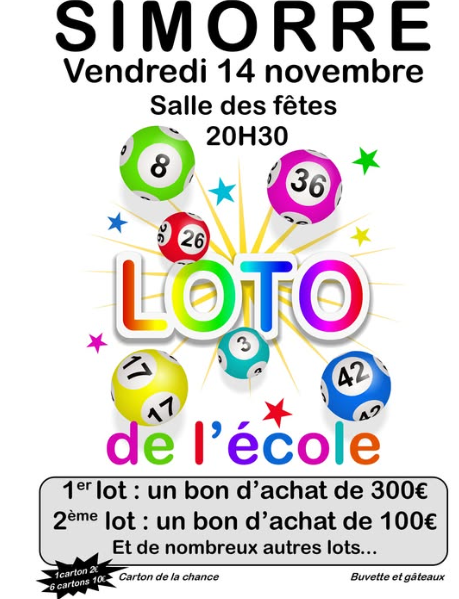Loto de l'école organisé le vendredi 14 novembre à partir de 20h30 à la salle des fêtes de Simorre.
