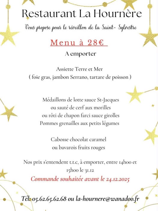 Le restaurant La Hournère vous propose un menu à emporter pour le réveillon de la Saint-Sylvestre.