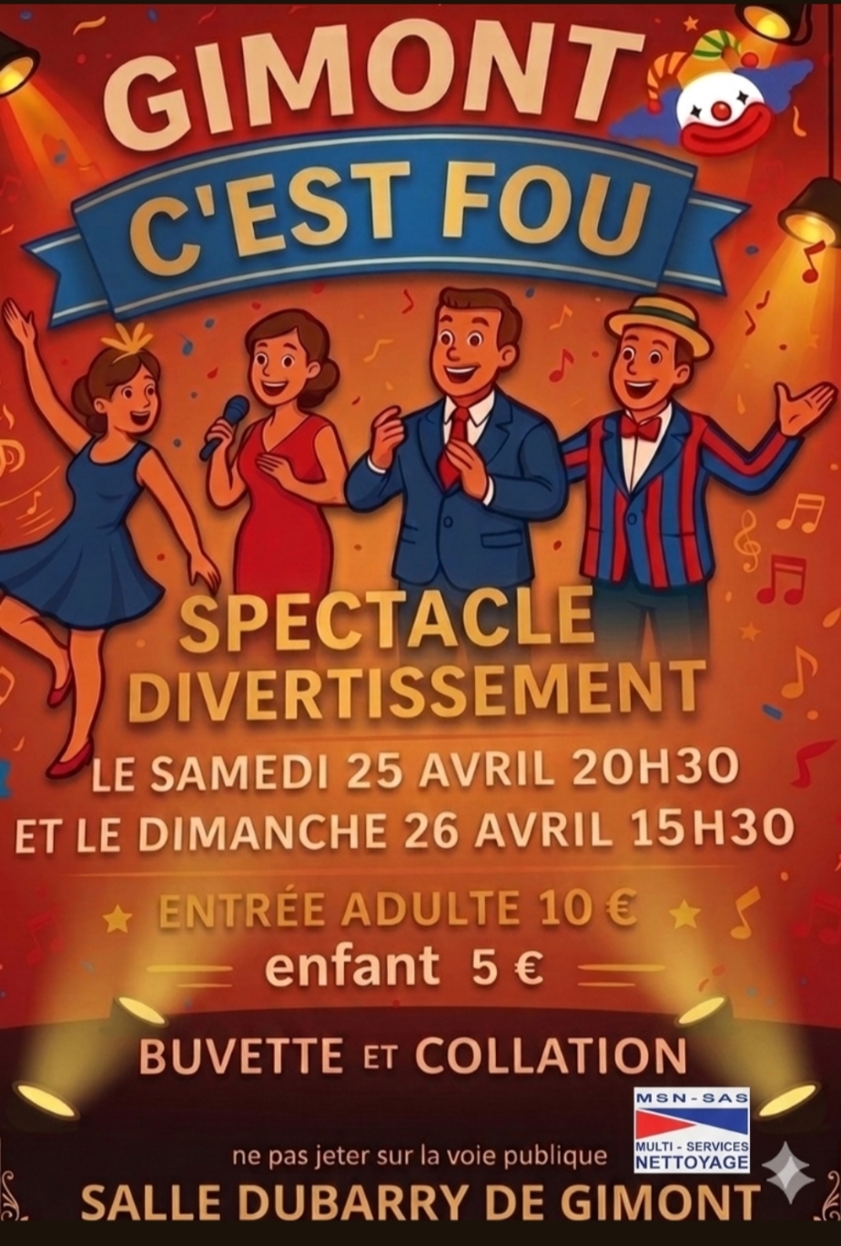 Le samedi 25 avril à 20h30 et le dimanche 26 avril à 15h30 aura lieu le spectacle "Gimont c'est fou".